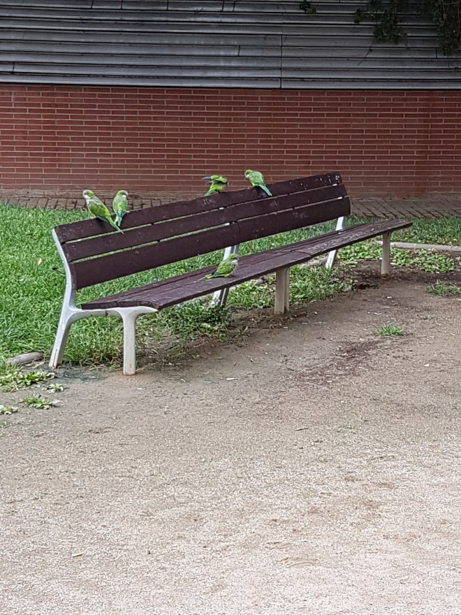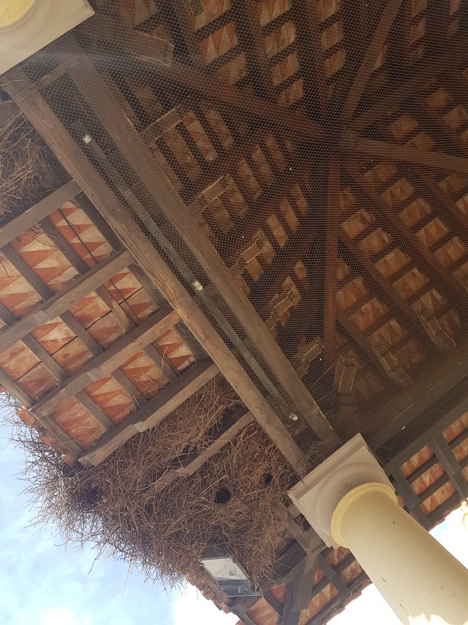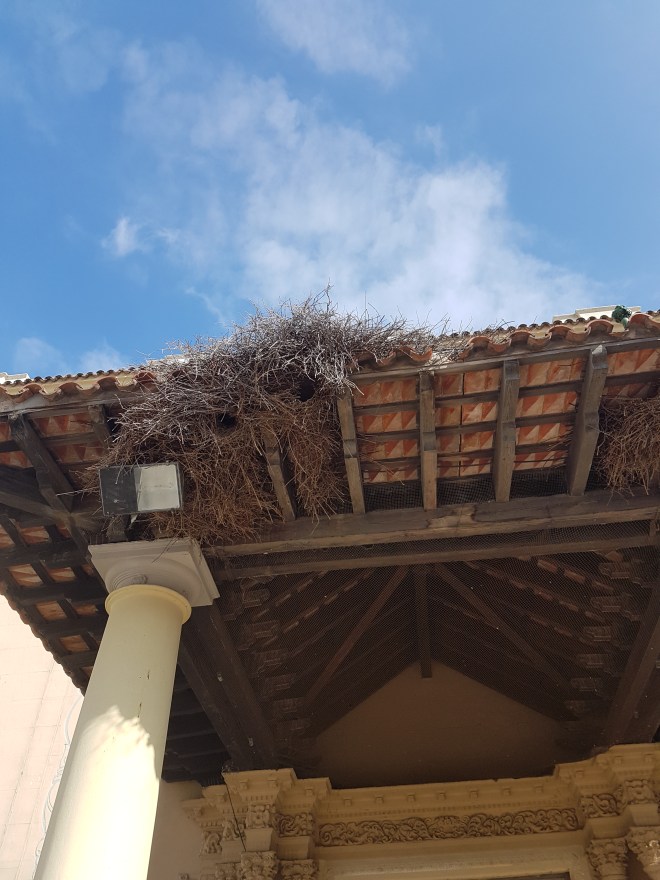 La Cotorra Argentina ( Myiopsitta monachus) ya no se conforma con los sustratos habituales de colonización, principalmente palmeras, busca de nuevos, en la imagen se ve un bajo soportal colonizado, se había puesto una red anti palomas, pero la cotorra ha buscado espacio para el anidamiento.
