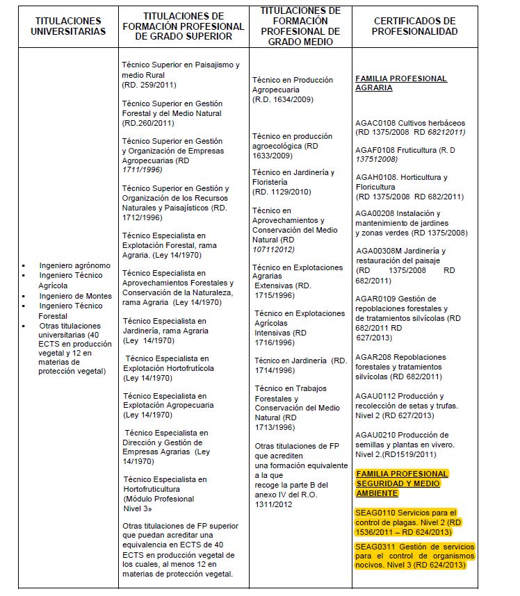 control de plagas. Nivel 2 y SEAG0311 Gestión de servicios para el control de organismos nocivos. Nivel 3, acreditan el Carnet Fitosanitario Nivel Cualificado.