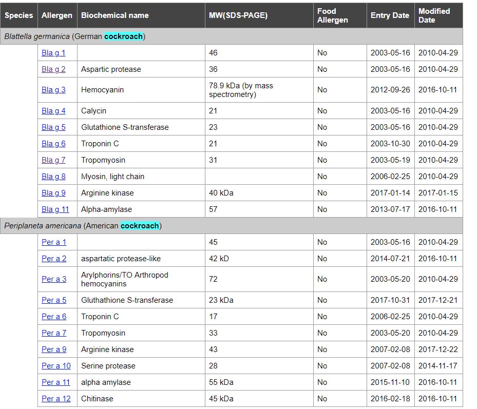 Todas las alergias por cucarachas están referidas en la página web oficial para la nomenclatura sistemática de alérgenos, que está aprobado por la Organización Mundial de la Salud (OMS) y la Unión internacional de sociedades inmunológicas (WHO/lUIS)
