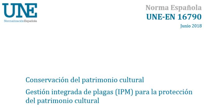 Recientemente ha sido publicada la Norma UNE EN 16790 Conservación del Patrimonio Cultural (Gestión Integrada de Plagas), está muy bien que un campo del control de plagas un poco desconocido, establezca unos criterios básicos de como actuar, es un campo complicado primero por la importancia que tiene Patrimonio Cultural (Museos, Bibliotecas, archivos, etc.) y segundo por la complejidad técnica que requiere, en la mayoria de estos casos implica el tratamiento de hongos, bacterias, liquenes, microorganismos, etc.
