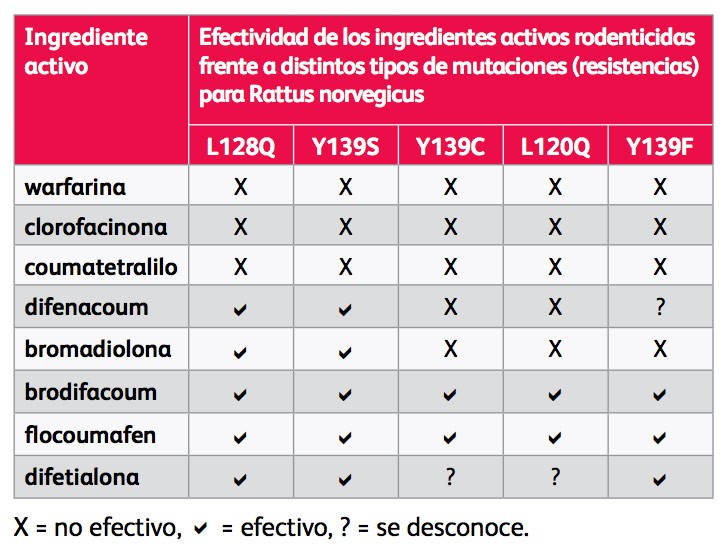 «Se están realizando estudios para varias mutaciones de VKORC1 para estimar el factor de resistencia para cada ingrediente activo de Rodenticidas Anticoagulantes. Usando datos generados en el Reino Unido, Alemania y Francia, el Grupo de Acción de Resistencia a Rodenticidas (RRAG) ha considerado el efecto de cinco mutaciones VKORC1 en el resultado del tratamiento cuando se usan FGAR o SGAR (ver RRAG, 2010). Con dos mutaciones (L128Q e Y139S), la preocupación es que es probable que las FGAR sean ineficaces, y para tres mutaciones (Y139C, Y139F y L120Q), la preocupación es que las FGAR, la bromadiolona y el difenacoum probablemente sean ineficaces. El documento captura la visión actual del impacto potencial de la diferencia de mutaciones VKORC1 en el resultado del tratamiento utilizando FGAR y SGAR, y debe adoptarse en todos los Estados Miembros para obtener orientación sobre qué sustancias activas no deben usarse contra poblaciones de ratas norvegicus resistentes que poseen una mutación VKORC1 conocida.