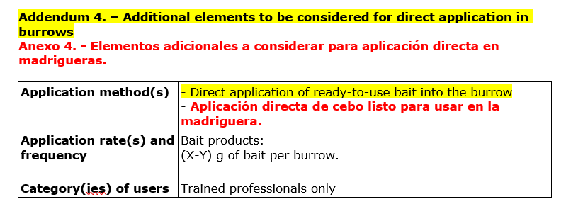 El anexo 4 que está dentro de Metodos de Aplicación, sobre aplicación directa en madrigueras y refiere al anexo 4, que dice lo siguiente;