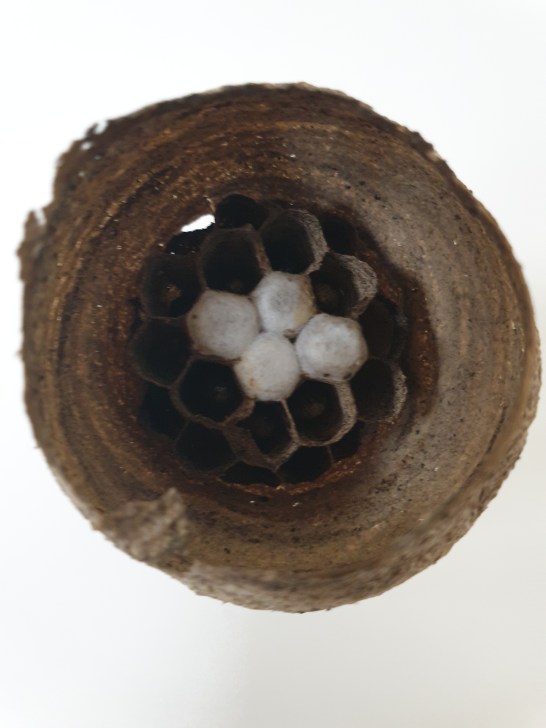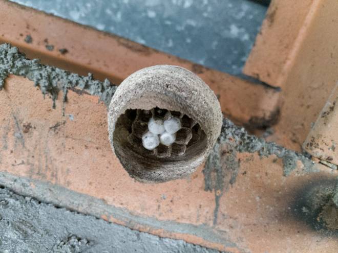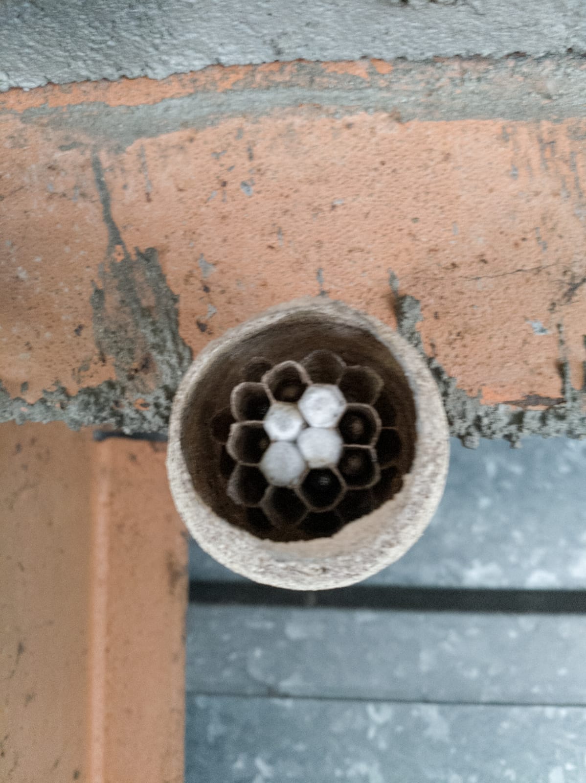 Una vez construidas las primeras celdillas, la reina deposita 3 o 4 huevos. En los siguientes días, la reina añade varias envolturas que protegen al “paraguas”, y así forma una entrada en la parte baja del nido.