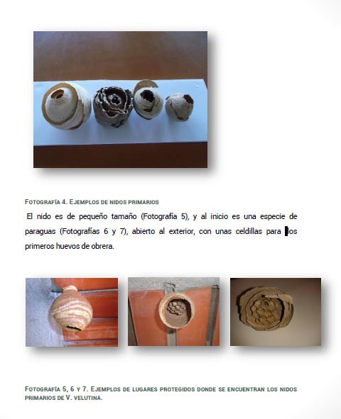 La avispa fundadora o futura reina es la encargada de construir el nido primario o embrión, dando soporte físico a su progenie para establecer una nueva colonia (Fotografía 4). Este nido temprano siempre se encuentra en lugares protegidos, tanto de las inclemencias del tiempo como de posibles depredadores. Pueden estar en edificios o construcciones humanas, chabolas, tejados, ventanas, dentro de almacenes, casas, colmenas vacías etc. (Fotografía 4) o en zonas forestales resguardadas (arbustos, debajo de la tierra…).
