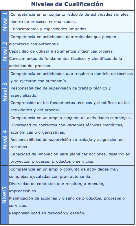 Nivel de cualificación profesional: 2 «Competencias en Actividades determinadas que pueden ejecutarse con autonomia, capacidad de utilizar instrumentos y técnicas propias, Conocimiento de fundamentos técnicos y cientificos de la actividad del proceso»