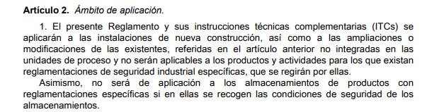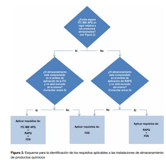 El Reglamento de almacenamiento de productos químicos (aprobado por el Real Decreto 379/2001 y modificado por el Real Decreto 105/2010) contiene normas de carácter general relativas a las condiciones de seguridad de las instalaciones de almacenamiento, carga, descarga y trasiego de productos químicos peligrosos; mientras que las instrucciones técnicas complementarias derivadas del citado Reglamento (actualmente están en vigor nueve ITC MIE APQ, aprobadas por diferentes normas) establecen exigencias técnicas específicas para almacenamientos de diferentes productos químicos que se consideran necesarias, de acuerdo con el estado de la técnica actual, para garantizar la seguridad de personas y bienes