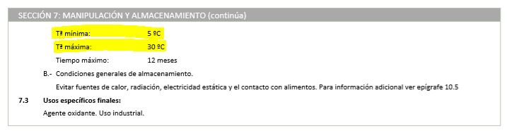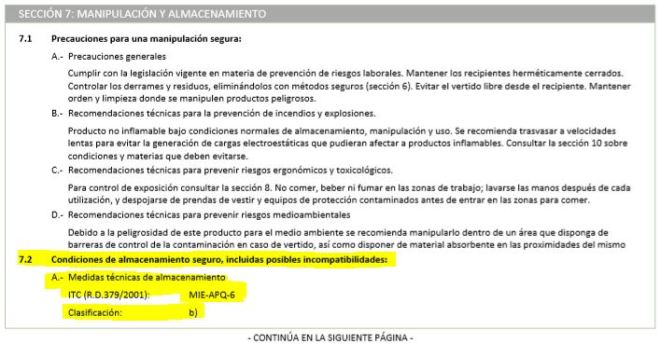 Este es el apartado 7 de la Ficha de Datos de Seguridad, si entramos en el apartado 8 SECCIÓN 8: CONTROLES DE EXPOSICIÓN/PROTECCIÓN INDIVIDUAL entraríamos como decíamos ante La ley de prevención de Riesgos Laborales y los Real Decreto 486/1997 por el que se establecen las disposiciones mínimas de seguridad y salud en los lugares de trabajo, el Real Decreto 374/2001 sobre la protección de la seguridad y la salud de los trabajadores contra los riesgos relacionados con los agentes químicos durante el trabajo (No voy a entrar)
