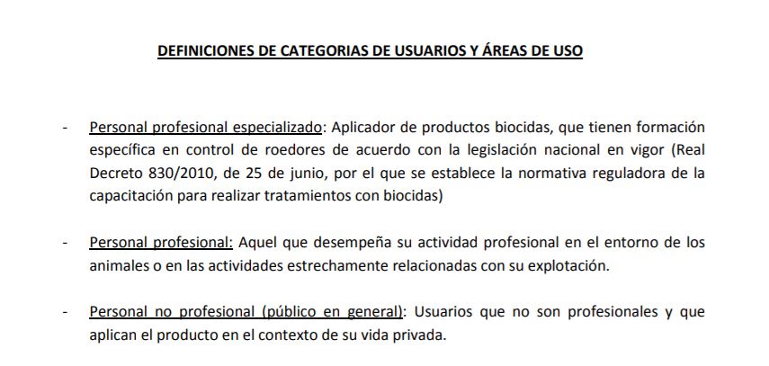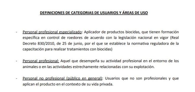 «La definición que se da de «usuarios profesionales» es mucho más amplia y engloba muchas más profesiones de la que ha circunscrito el Ministerio, parece ser que para los rodenticidas, que solo engloba al ámbito ganadero en su propia explotación. Viendo algunos registros de insecticidas ya pasados al nuevo registro parece que la categoría de usuario, seria;