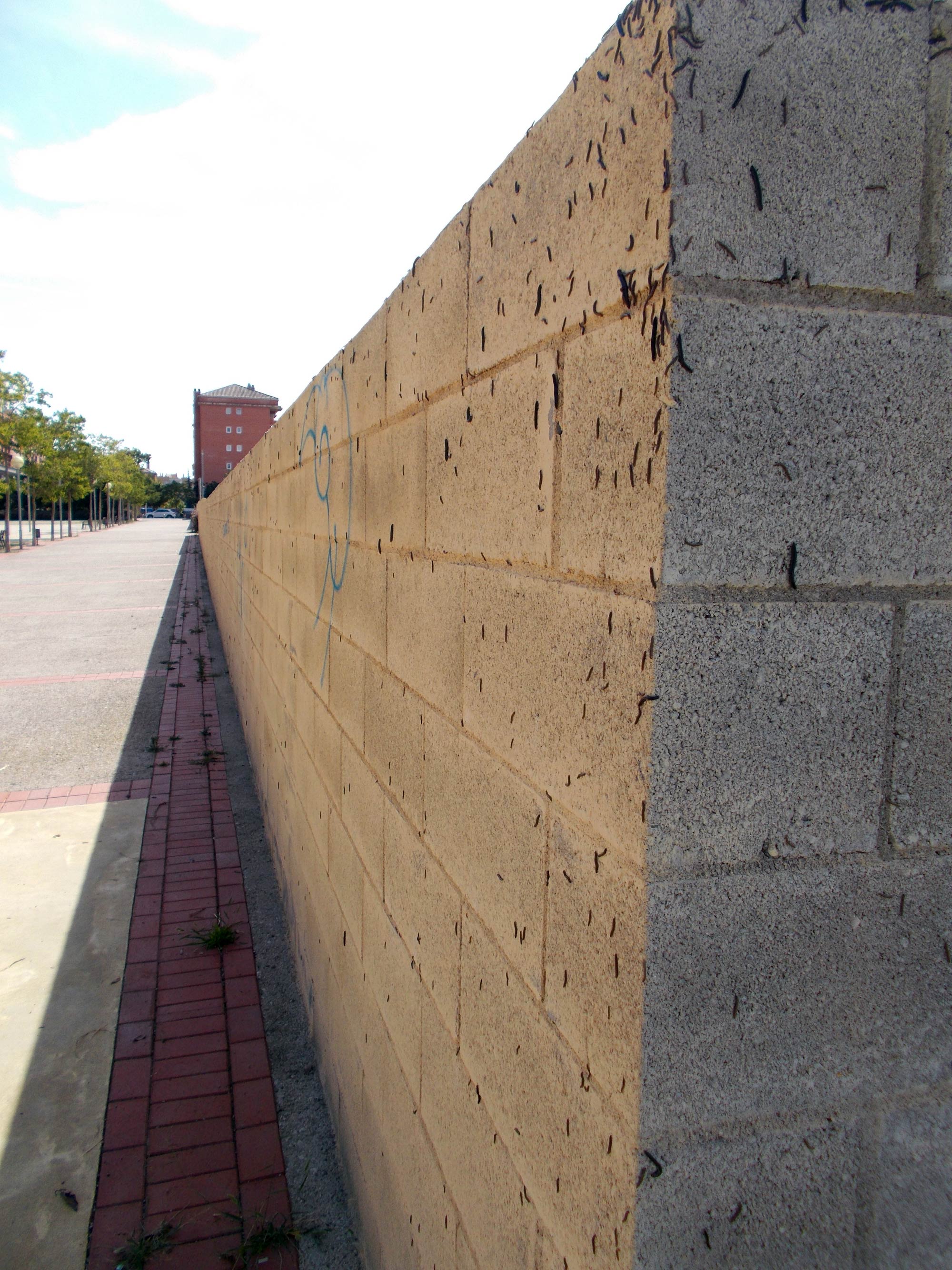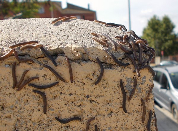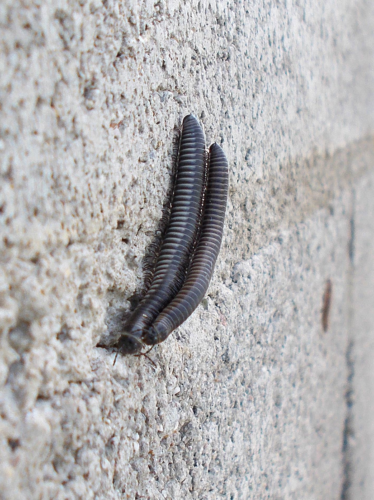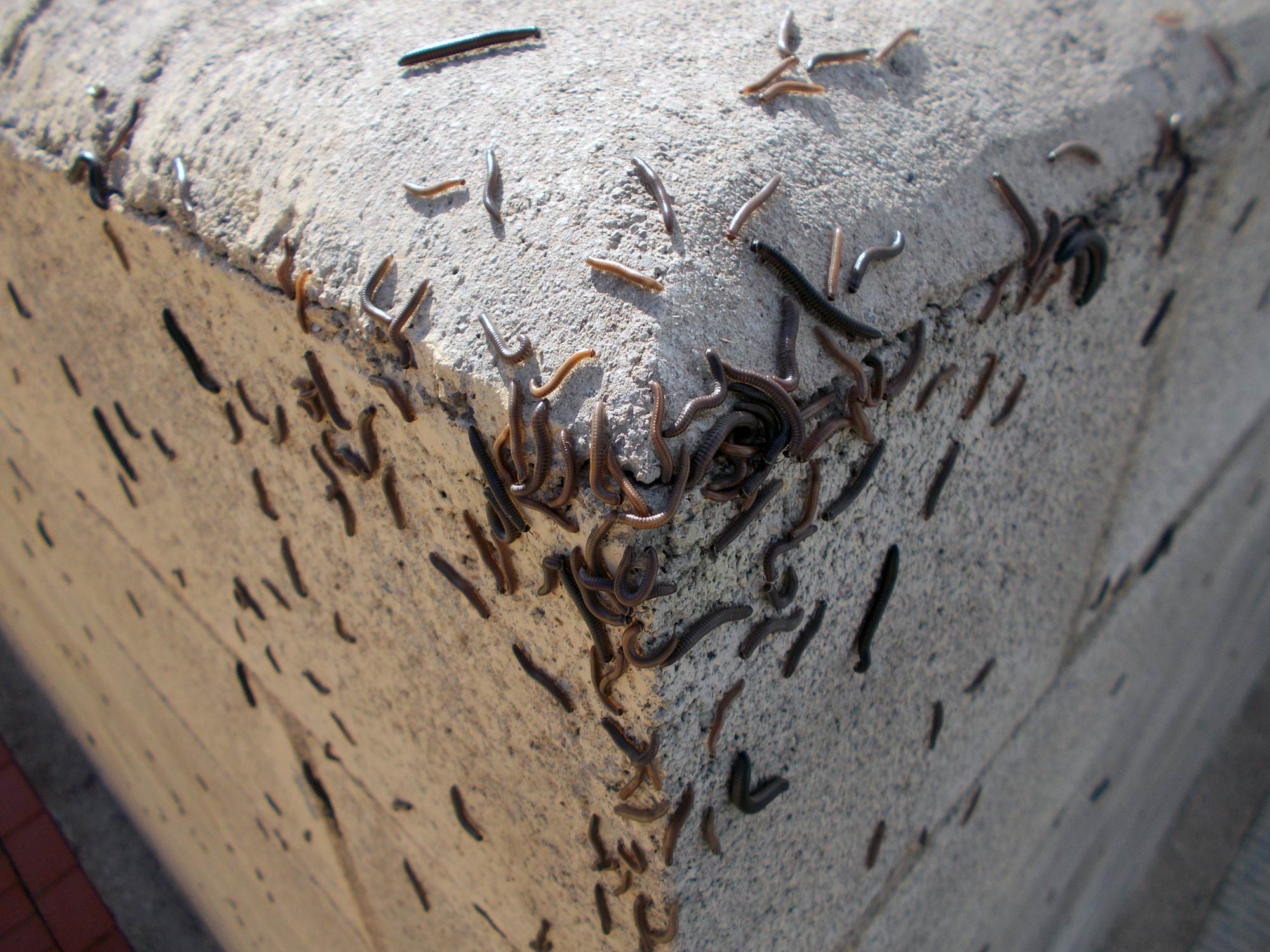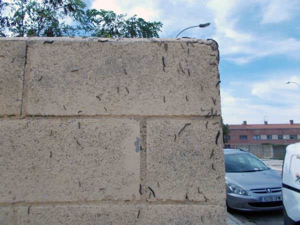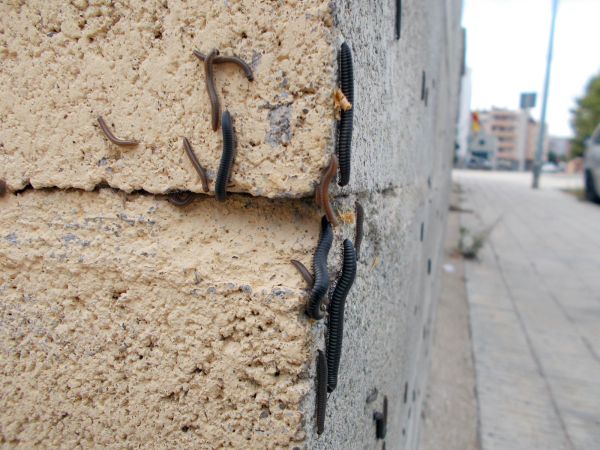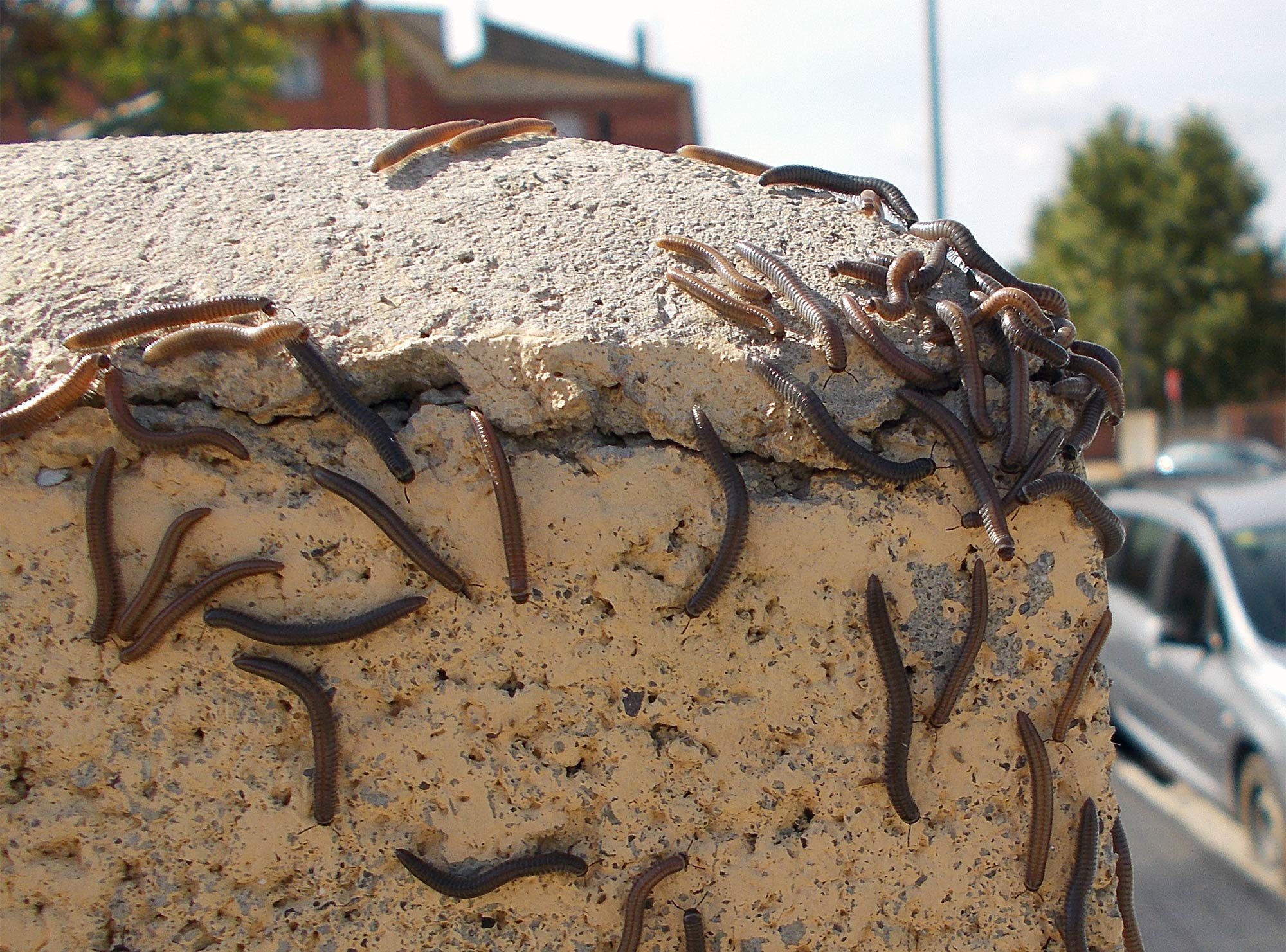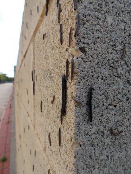 Este verano nos hemos encontrado con una proliferación importante de milpiés. En algunos lugares han llegado a convertirse en un problema. En las fotografías se puede ver un ejemplo de ello. En la primera imagen se puede ver una pared que rodea un terreno no urbanizado. La maleza que ha crecido en el interior al amparo de la pared ha permitido que cientos de milpiés campen a sus anchas. Durante el día van saliendo y atraviesan la calle hasta llegar a los edificios vecinos. Luego entran en las casas por cualquier rendija. Algún vecino comentó que los había encontrado en su vivienda situada en una cuarta planta.